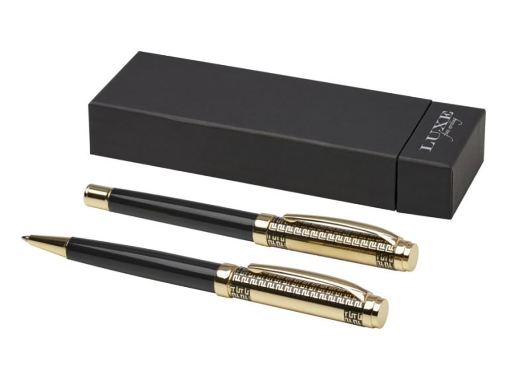 Набор ручек Legato представляет собой элегантное сочетание шариковой ручки и ручки-роллера. Обе ручки имеют верхний корпус из переработанной латуни с золотой хромированной отделкой, нижний корпус с черным напылением, аксессуары из металлического золота с хромированием, логотип LUXE на среднем кольце и синие чернила. Шариковая ручка имеет длину письма 800 метров и размер пера 1,00 мм. Ручка-роллер имеет длину письма 400 метров и размер пера 0,7 мм. Recycled brass. #?0:>2:0: FSC Mix Credit P5.1 CU-COC-877277.