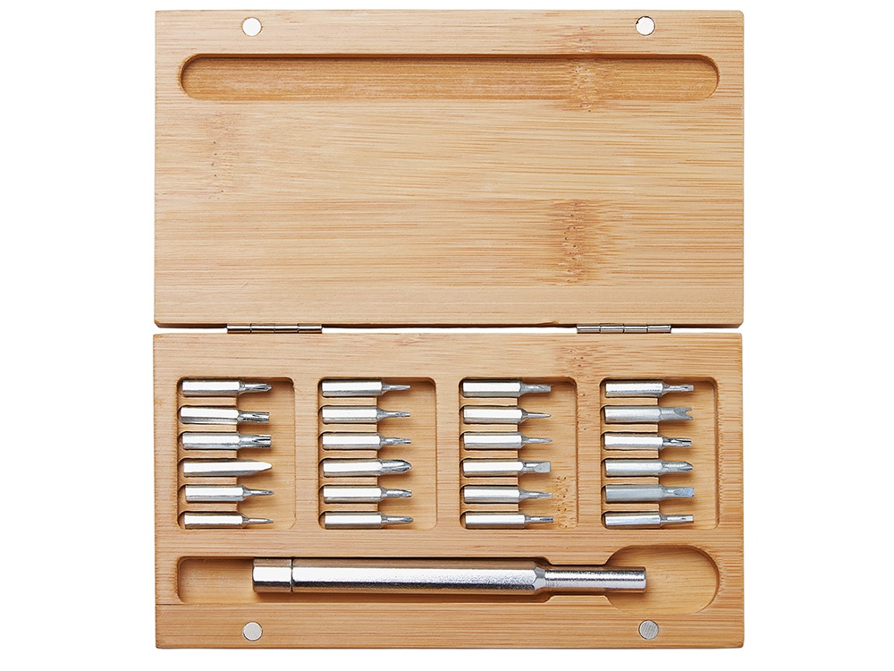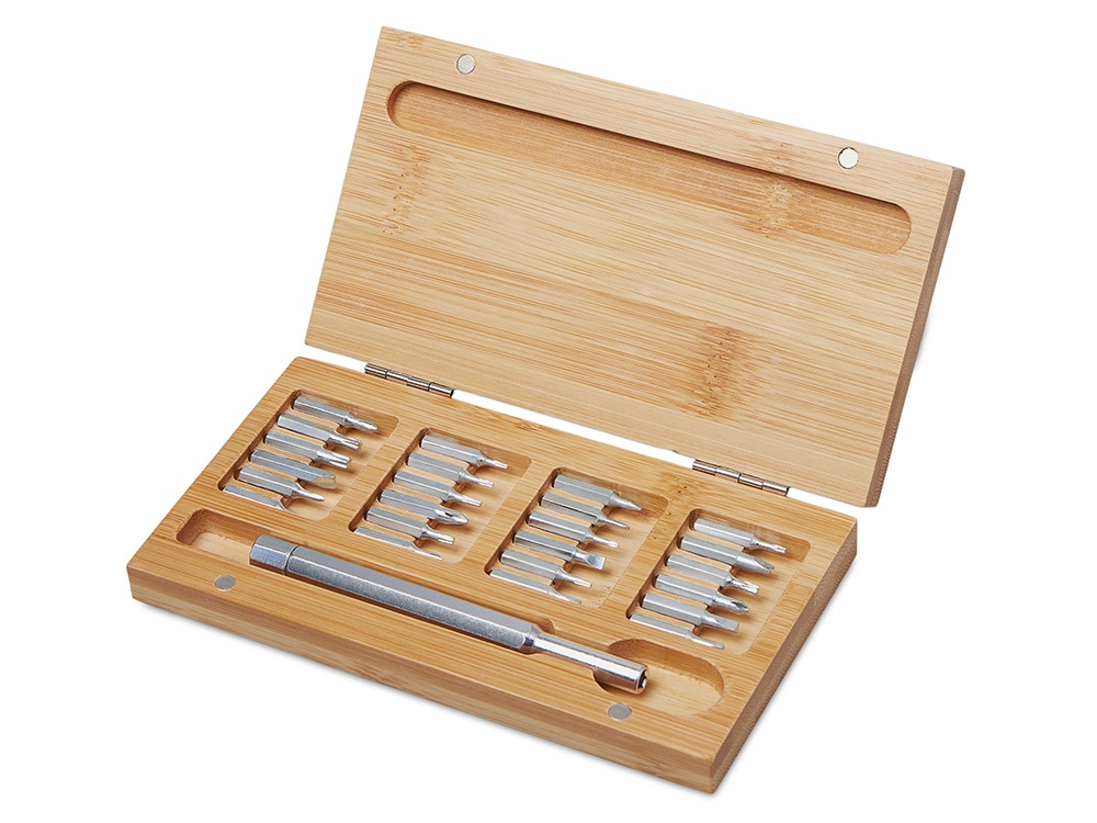 Стильный и практичный набор отверток в элегантном корпусе из натурального бамбука. Компактный кейс закрывается на магниты, а верхняя крышка отмечена круглым красным стикером для удобной идентификации. Внутри — отвертка и 24 наиболее востребованные биты: крестовые, плоские и «звездочки», которые подойдут для решения большинства бытовых и профессиональных задач. Набор выполнен из экологичных материалов — прочной стали и натурального бамбука. Классическая прямоугольная форма без выступающих деталей делает его особенно удобным для персонализации и нанесения логотипа.