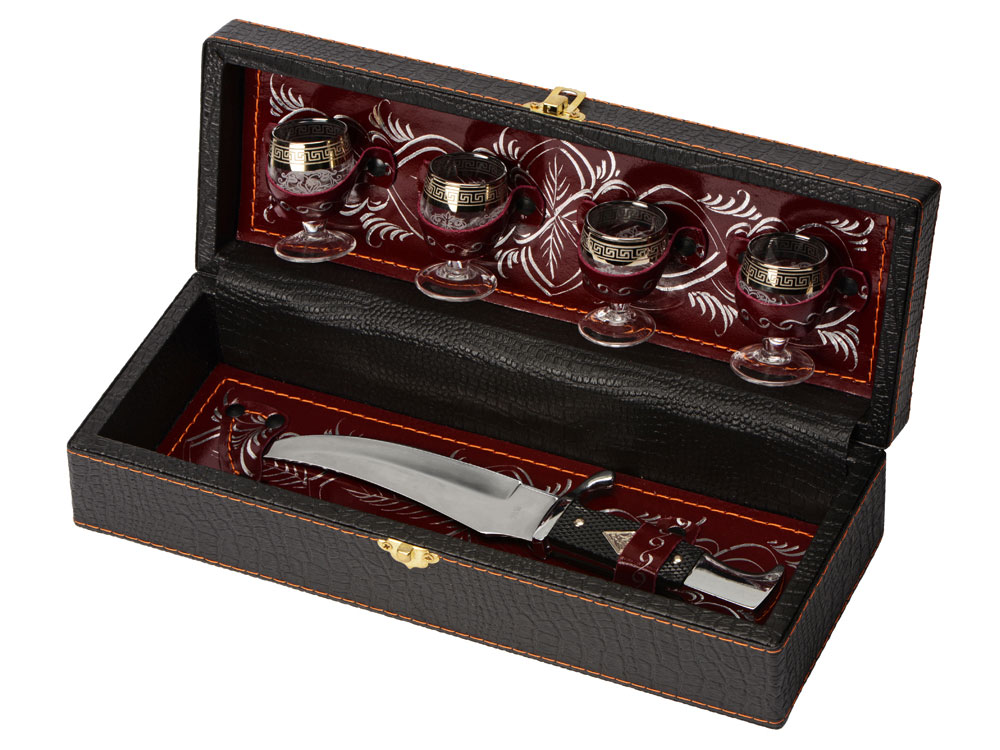 Шкатулка-футляр – хороший подарок, особенно, если в ней достойное содержание. Например, набор рюмок на 4 персоны и нож для закуски. Отдельно такой набор дарить не солидно – не красиво преподносить стопки без упаковки, а пустая шкатулка только разочарует – открывая такую красоту, всегда ждешь внутри что-то чудесное.
