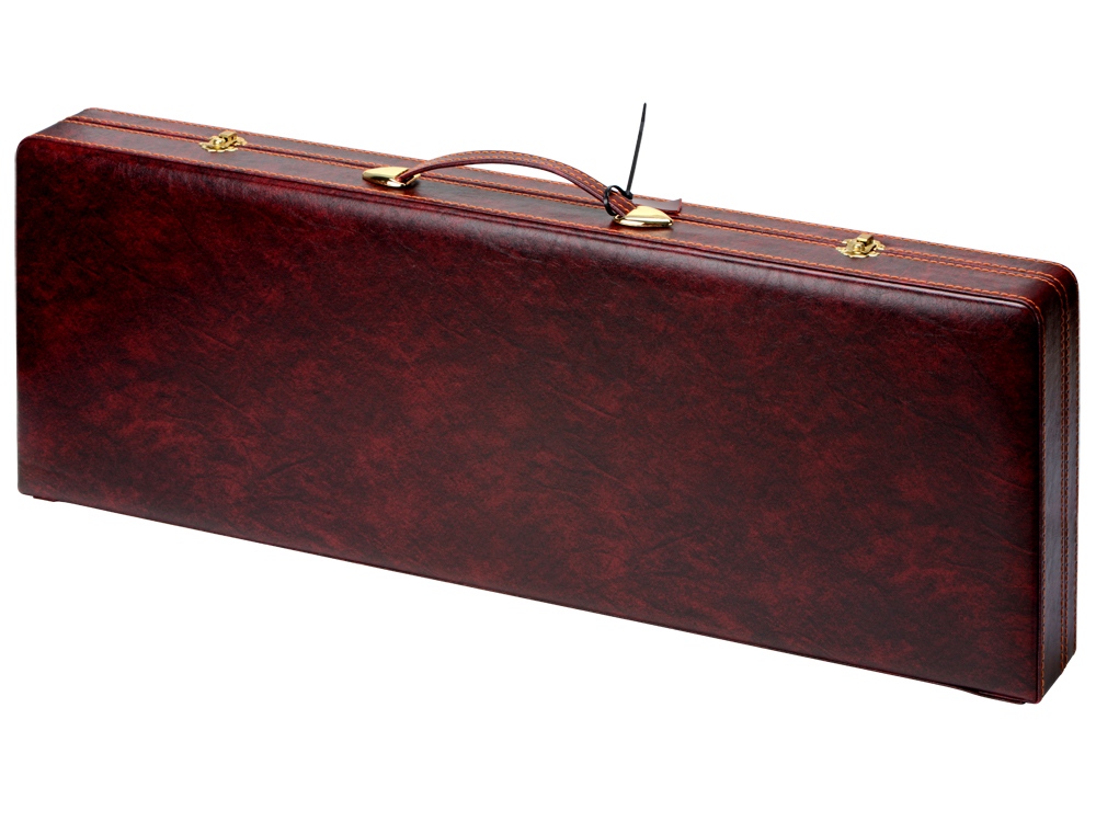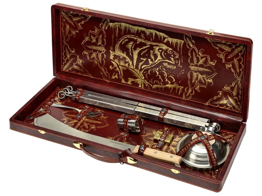 Кейс из сплит-кожи, с повышенной износостойкостью, внутренняя отделка натуральная кожа с художественным выжиганием. В комплекте: мангал- 1 шт шампура- 6 шт тарелка- 6 шт стопка- 6 шт зажигалка-1 шт вилка- 1 шт тесак-1 шт
