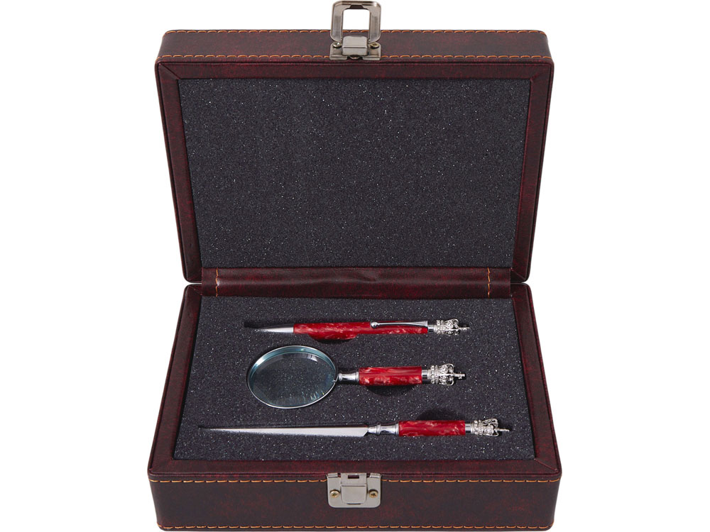 Подарочная упаковка: Набор представлен в жестком футляре из бордовой сплит- кожи с поролоновым ложементом, который гарантирует сохранность аксессуаров и подчеркивает ценность подарка.