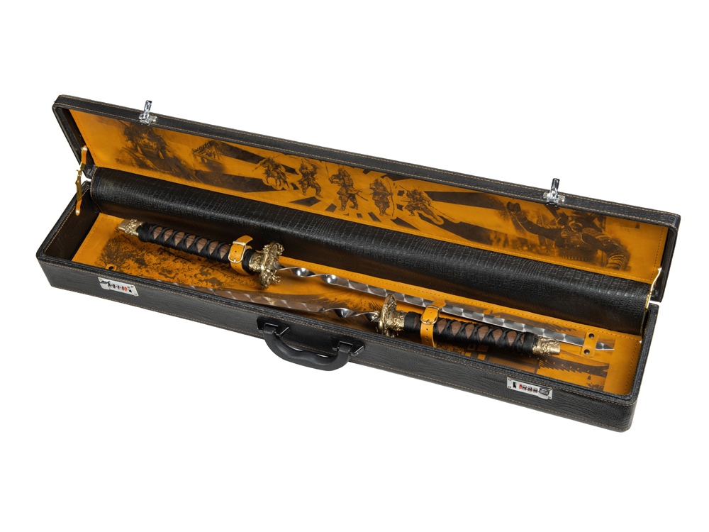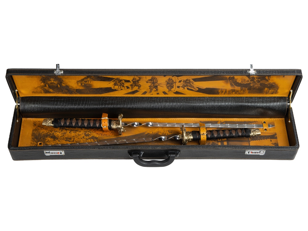 Кейс из сплит-кожи, с повышенной износостойкостью, внутренняя отделка- натуральная кожа с художественным выжиганием. Набор состоит из двух шампуров. Шампур- 82 см, рабочая поверхность- 40 см.