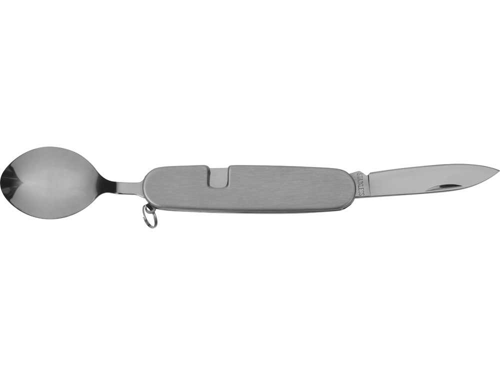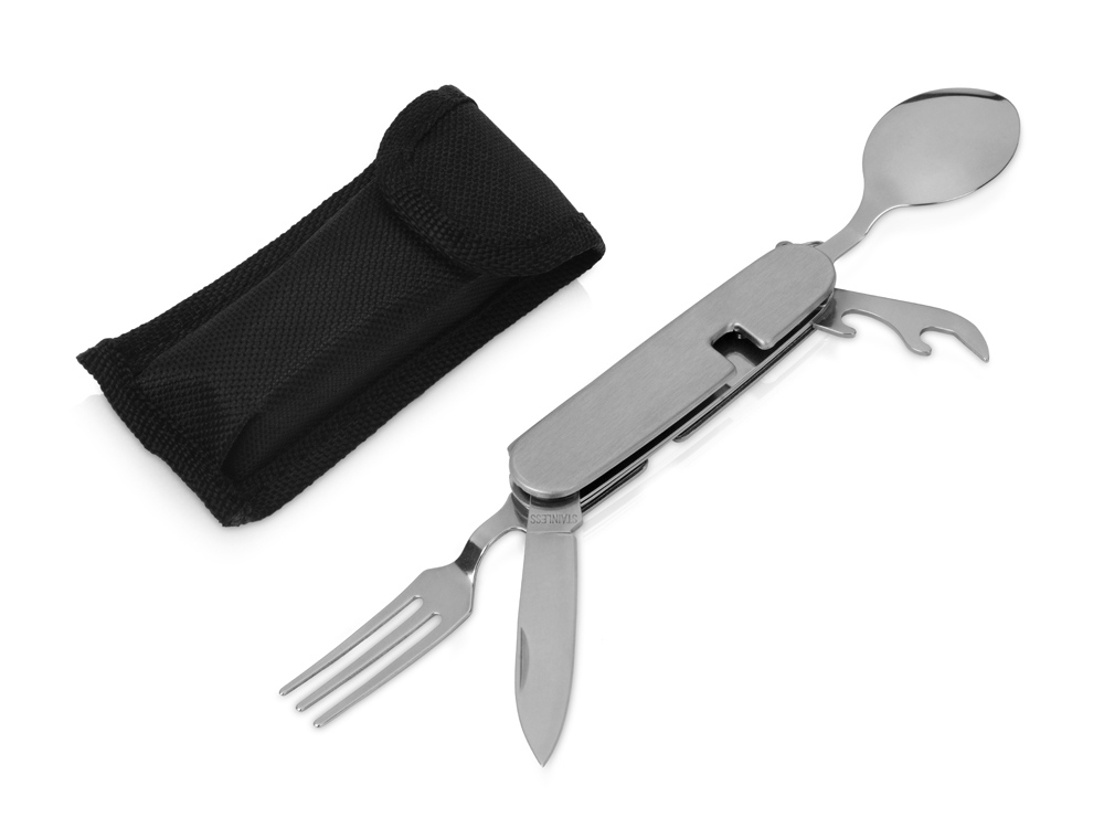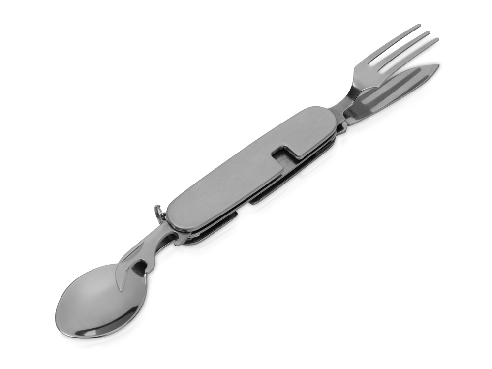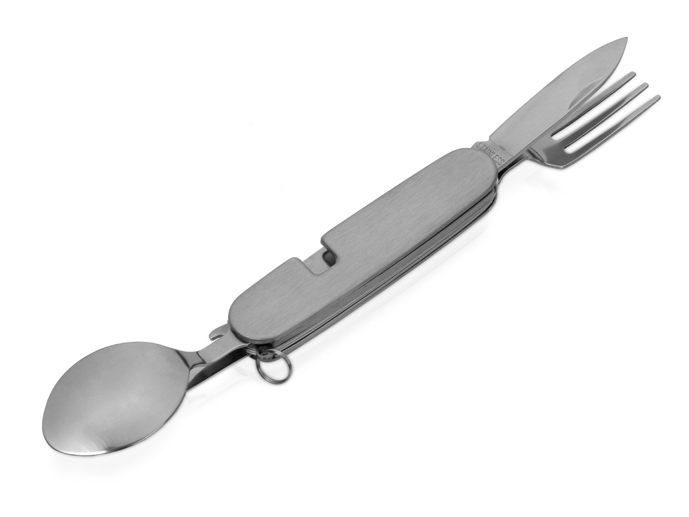 В нем есть все, что необходимо — ложка, вилка, ножик, открывалка бутылок и жестяных банок. Также имеется удобное кольцо для подвешивания. Набор разделяется на две части.