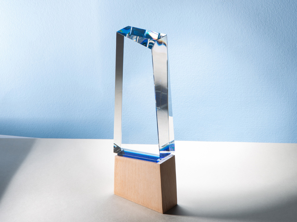 Вставка из синего стекла между основной частью и основанием позволяет награде бликовать синим цветом в зависимости от угла падения света.