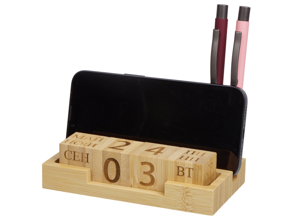Настольный органайзер с вечным календарем и подставкой для мобильного телефона станет очень удобным помощником для организации пространства на рабочем столе. Кубиками можно выставить нужную вам дату и день недели. Также у органайзера есть подставка для визиток, телефона и 2-х ручек.