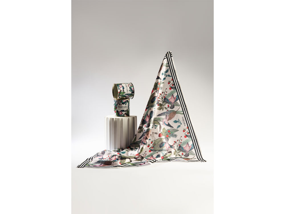 Принт нарисован художницей вручную специально для бренда Varvara. Художница размышляла на тему русской природы, культуры и искусства – тут и лесная земляника, и сочная зелень, и сказочные зайцы с фазанами. Композиция рисунка, выполненная в стиле иллюстраций к русским сказкам, переносит нас в атмосферу сказочного леса.