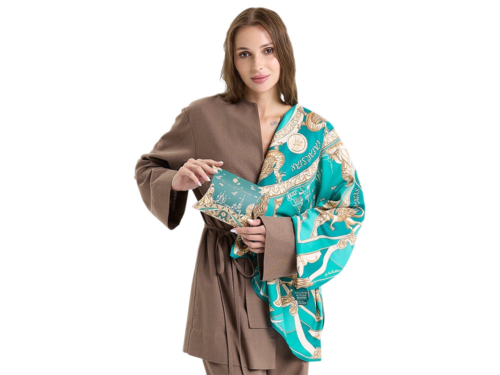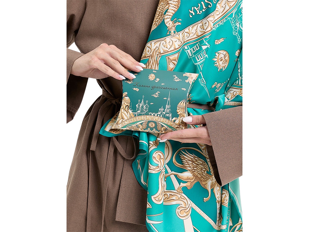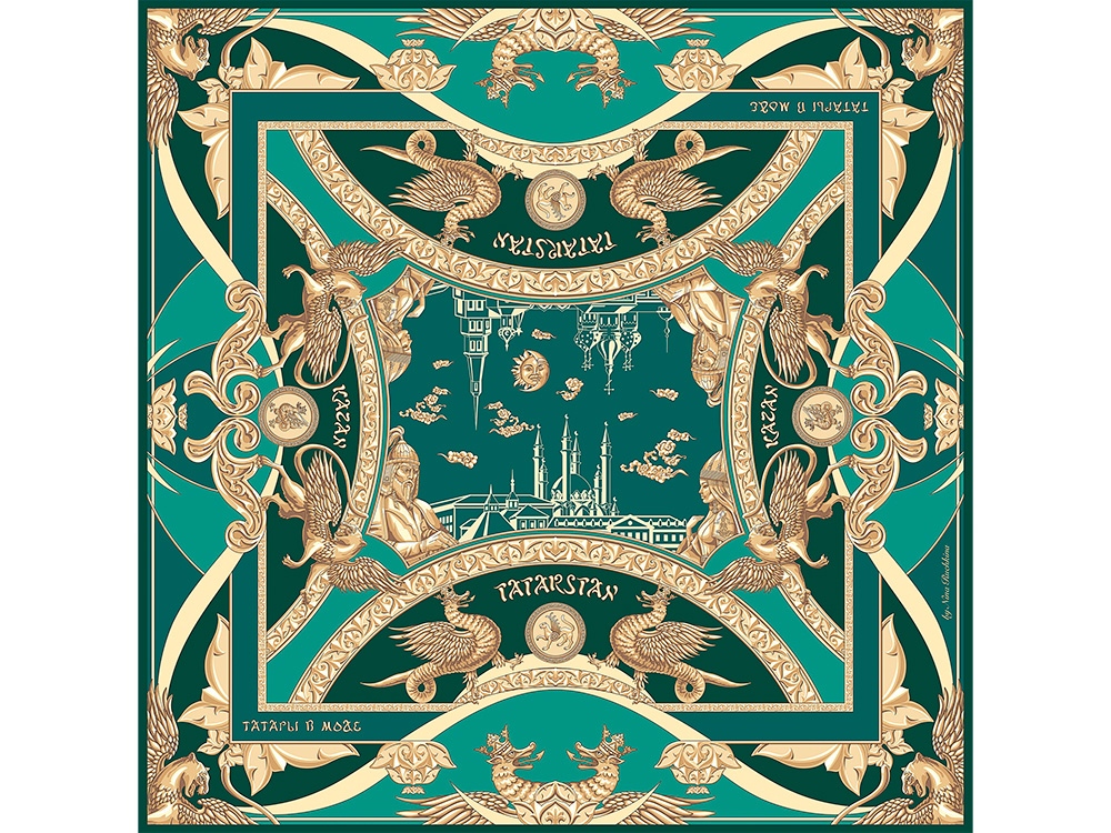 Немаловажное место в общем решении платка занимает Коронованный дракон Зилант— официальный символ, изображенный на гербе города Казани.