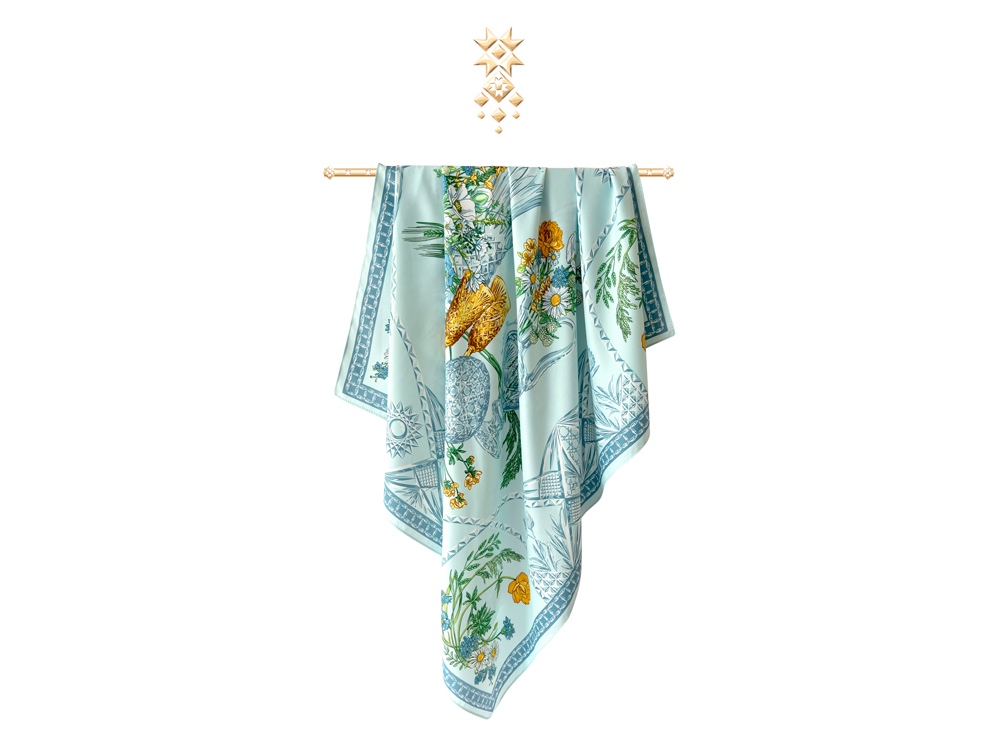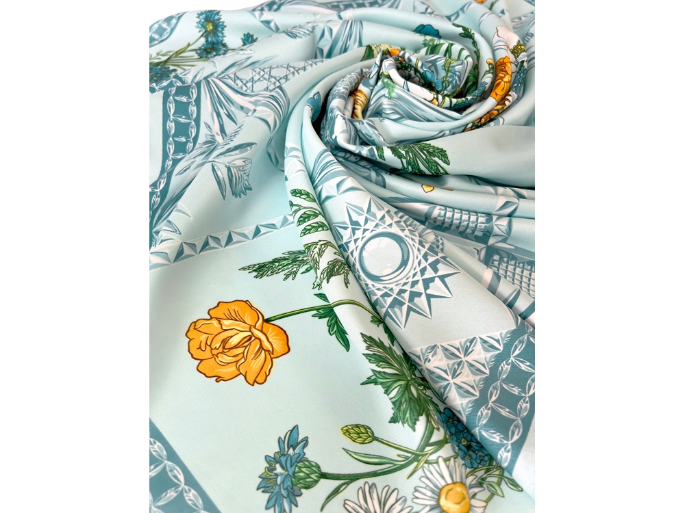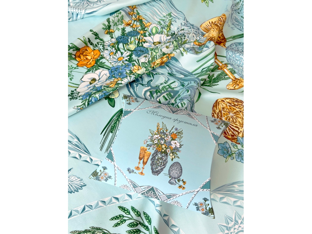 Дизайн платка связан со стилевой эстетикой советской школы натюрморта. Перед нами ажурная скатерть стола, декорированного композицией из хрусталя и полевыми цветами. Нежные переливы сине-голубых тонов подчеркнуты ярко-желтыми и белыми бутонами, стеблями сочных трав и золотистыми бокалами. Ажур скатерти вторит хрустальному узору фужеров, ваз и сувенирных пасхальных яиц, задавая душевное настроение.