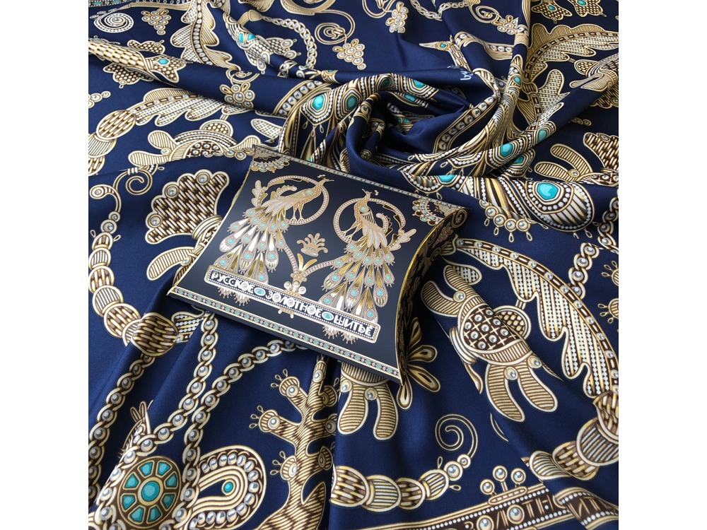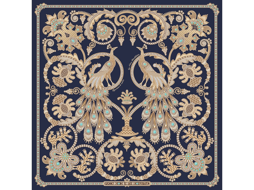 Платок «Русское золотное шитьё» посвящён драгоценному старинному русскому рукоделию. Дошедшие до нас памятники шитья, выполненные русскими мастерицами, являются произведениями высокой культуры. В изделиях сочетаются талант художника и тонкий вкус, духовное богатство, исполнительское мастерство вышивальщиц.