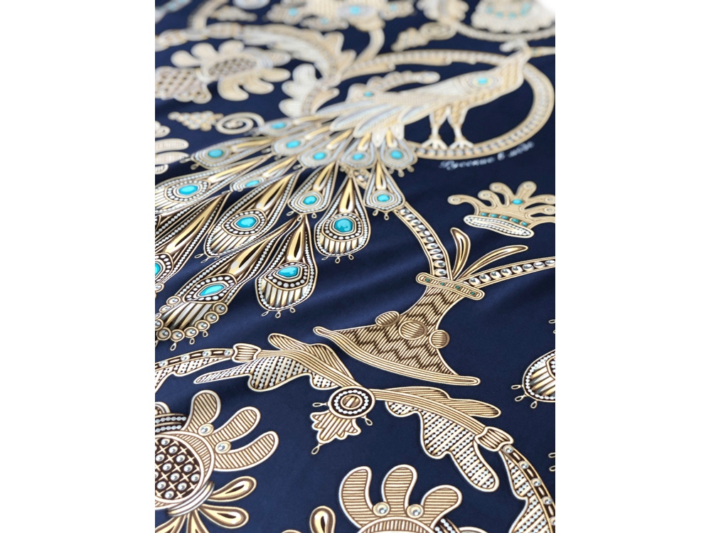 В центре композиции излюбленный сюжет традиционного русского орнамента – царственные павлины. Они горделиво восседают в обрамлении из фантастических цветов и виноградных лоз.