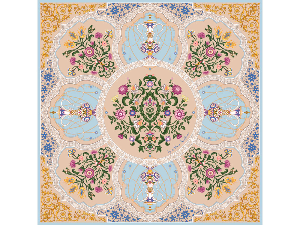 Принт аксессуара образуют знаменитые орнаменты востока — гирих (бесконечный “узел”) и ислими (“путь в божественный сад”). Непрерывные витиеватые линии в сочетании с узорами из гибких стеблей с зеленой листвой и пестрыми соцветиями завораживают, погружают в состояние медитации, постижения тайны мироздания через призму счастья и красоты.