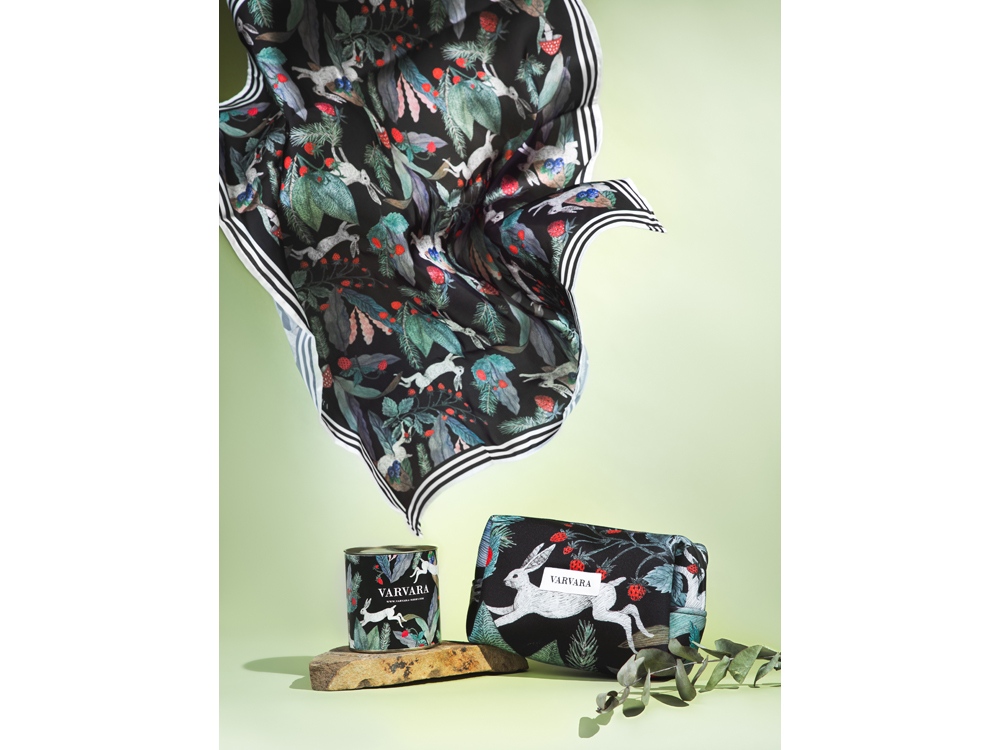 Принт нарисован художницей вручную специально для бренда Varvara. Художница размышляла на тему русской природы, культуры и искусства — тут и лесная земляника, и сочная зелень, и конечно, сказочные зайцы — как будто только что сошли с полотен В. Васнецова.