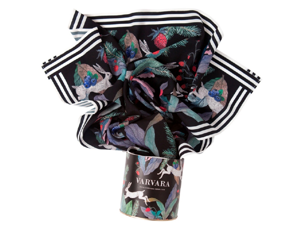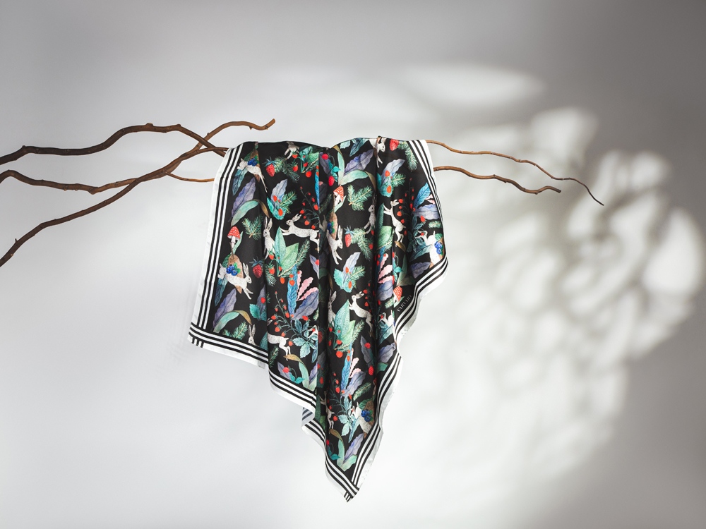 Принт нарисован художницей вручную специально для бренда Varvara. Художница размышляла на тему русской природы, культуры и искусства – тут и лесная земляника, и сочная зелень, и конечно, сказочные зайцы – как будто только что сошли с полотен В. Васнецова.