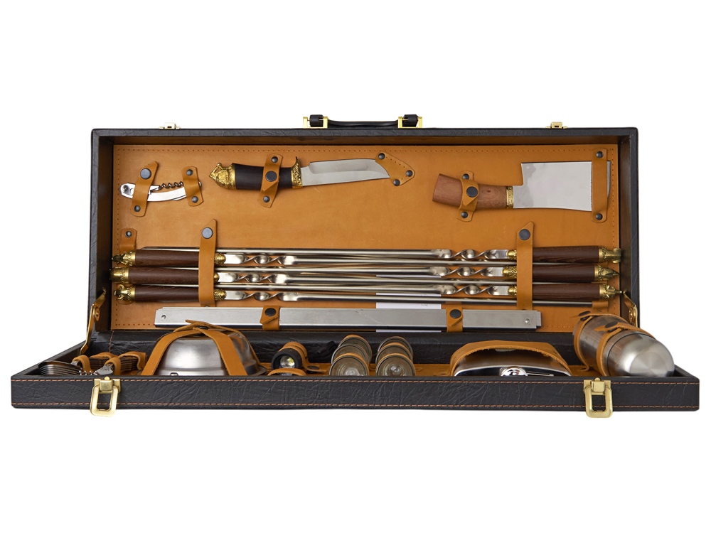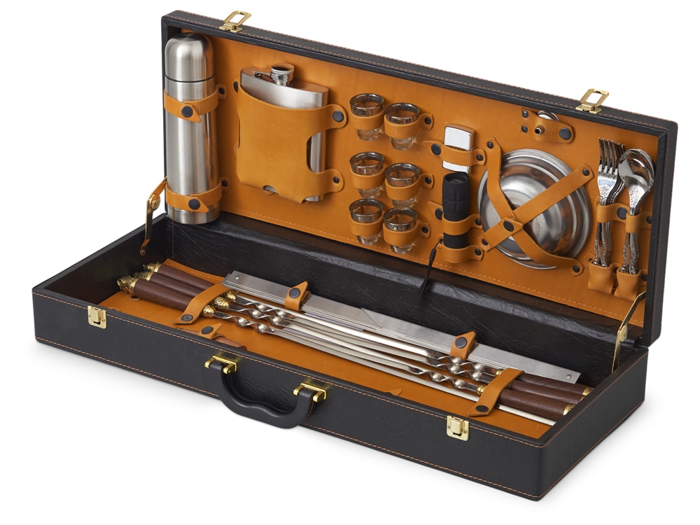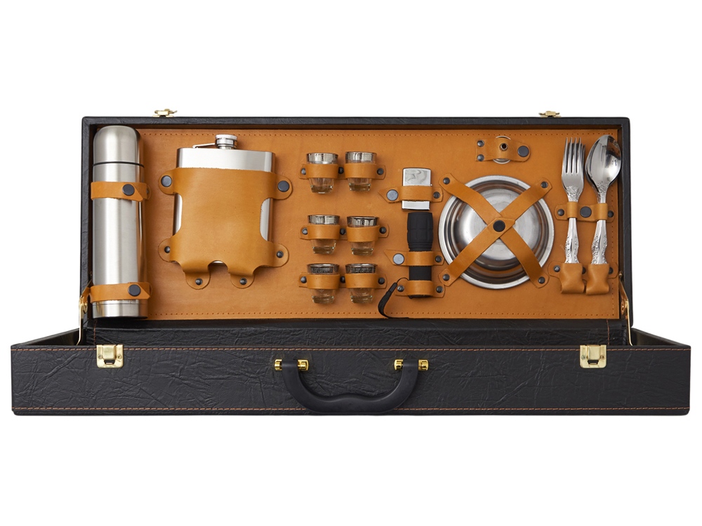 Все аксессуары надежно крепятся к кейсу кожаными ремешками на кнопке, обеспечивая удобство транспортировки и сохранность содержимого.