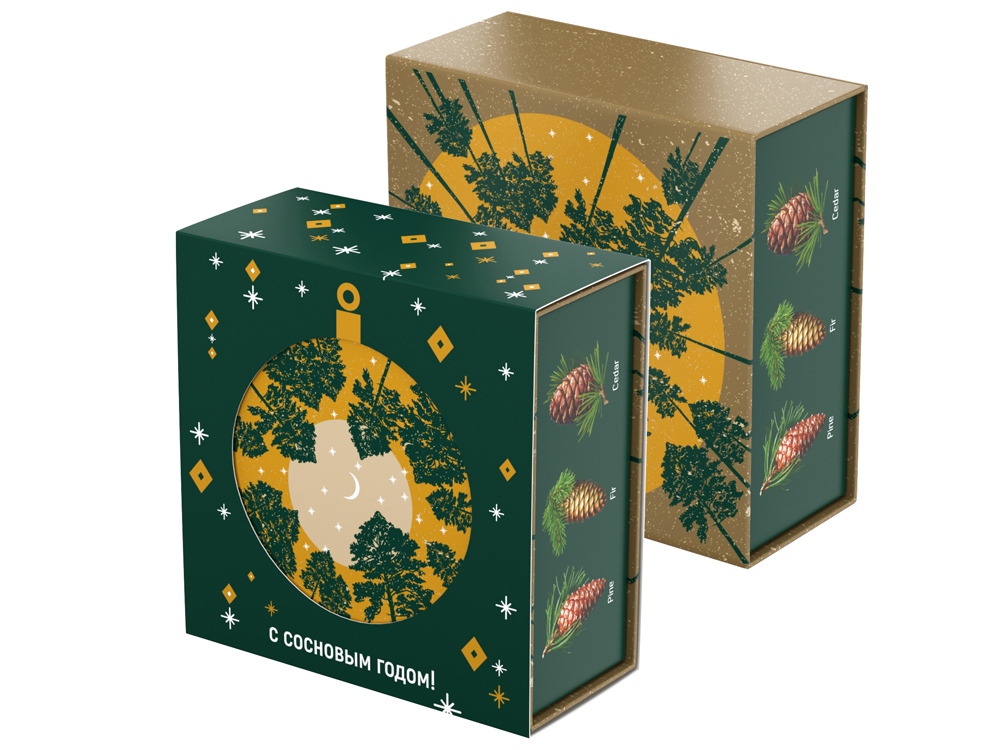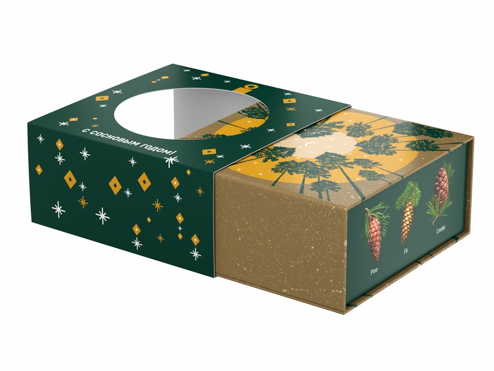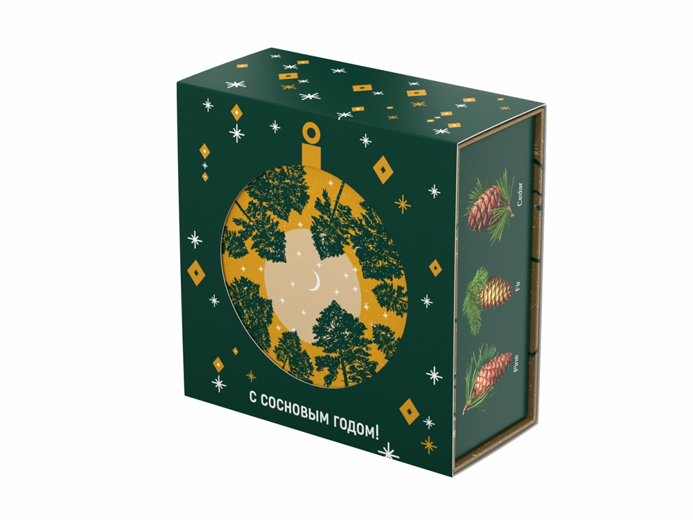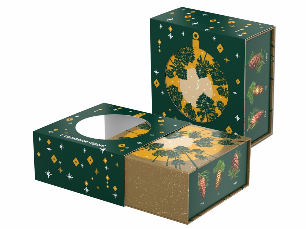 Аромат и вид хвои – символ Рождества и Нового года. «Хвойная» шкатулка «С сосновым годом!» оформлена праздничным паттерном и изображением шишек разных хвойных деревьев. На крышке шкатулки помещена иллюстрация, изображающая вид снизу вверх на звёздное небо и уходящие ввысь сосны. При надевании на шкатулку шубера (суперобложки) с круглым отверстием, на крышке шкатулки появляется вырубное изображение новогоднего шарика.