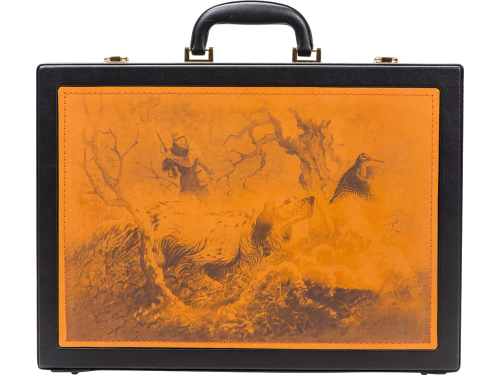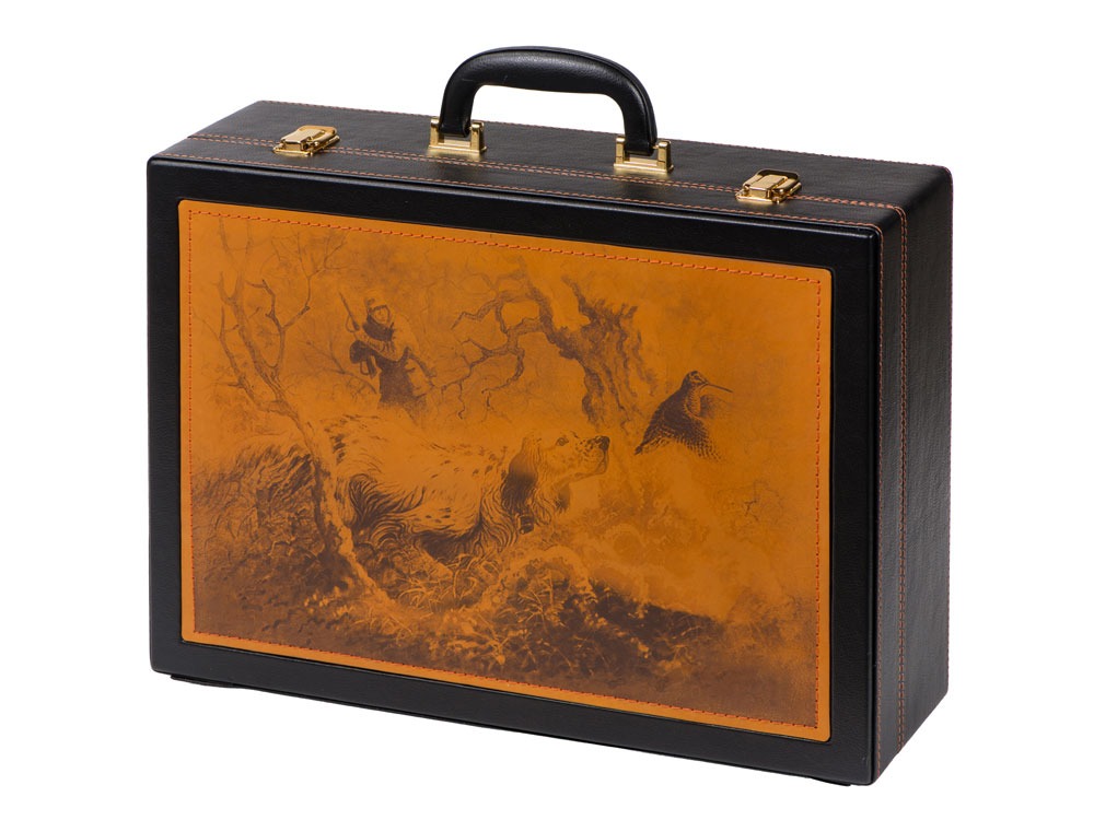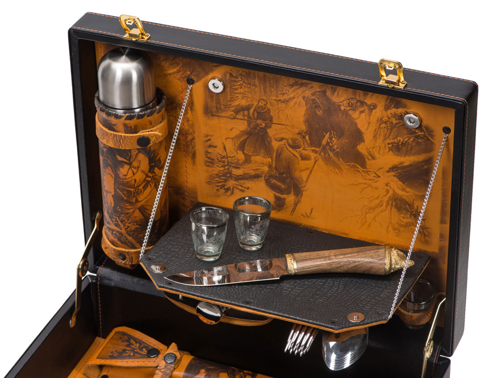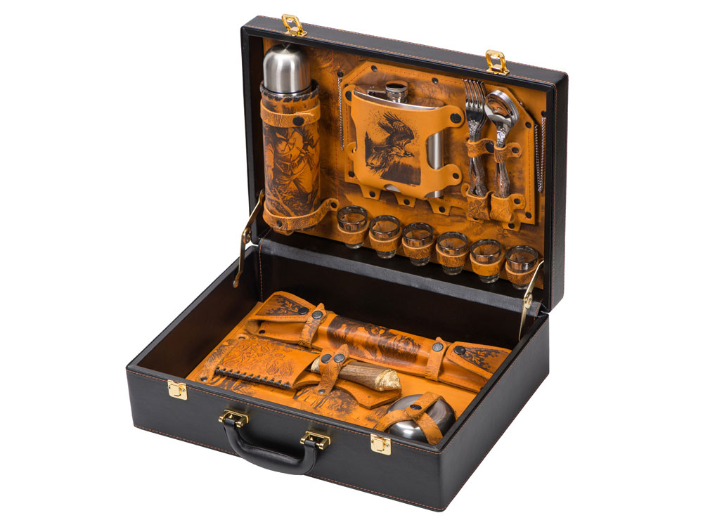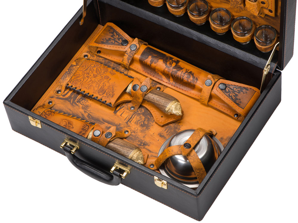 Набор «Охотничий азарт». Каждый кейс изготовлен из натуральной кожи. На наружных сторонах имеется свой уникальный авторский рисунок, выполненный в технике художественного выжигания. Внутренние элементы также отделаны натуральной кожей, которая различается по цветовым решениям. Остальные предметы подарочного набора изготовлены из высококачественной нержавеющей стали. Этот подарок идеально подойдет для настоящих мужчин с характером!