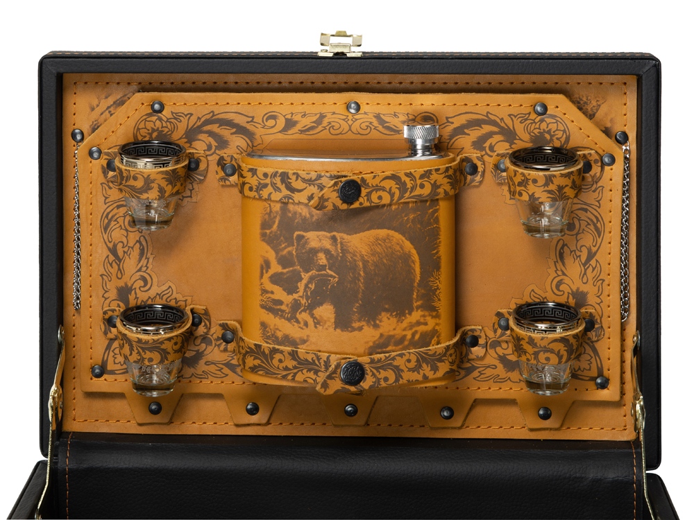 Кейс из сплит-кожи, с повышенной износостойкостью, внутренняя отделка натуральная кожа. В комплекте: Фляга 580 мл (нерж.сталь) – 1шт. Стопка 40 мл (стекло) – 4 шт. Зажигалка – 1 шт. Нож (нерж. сталь) – 1 шт. Тарелка – 4 шт.
