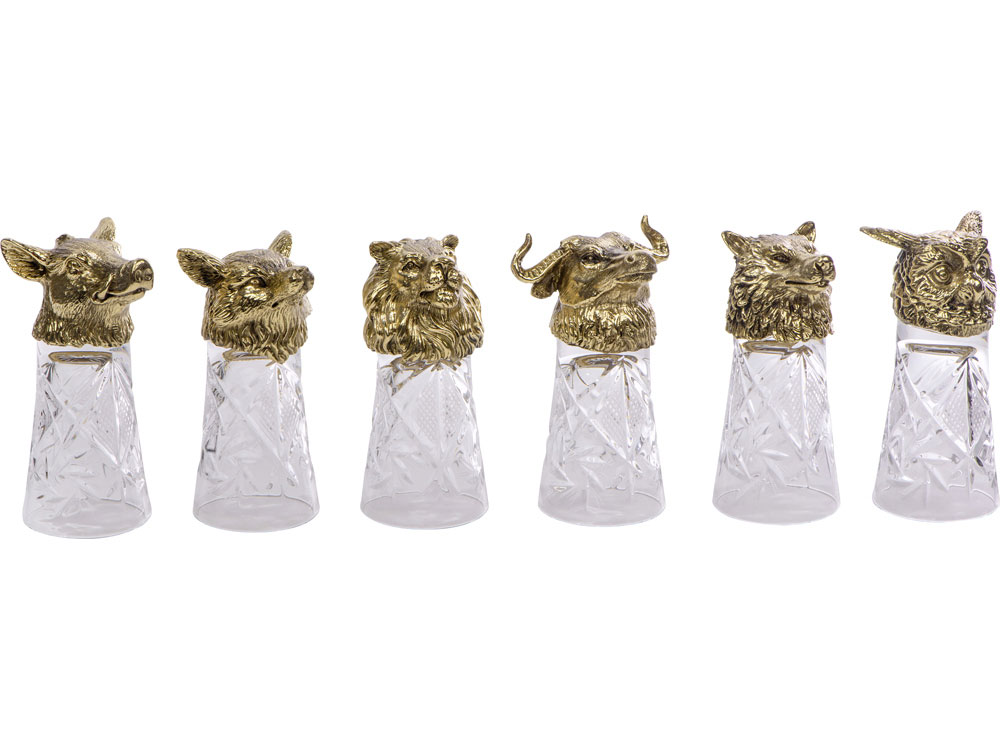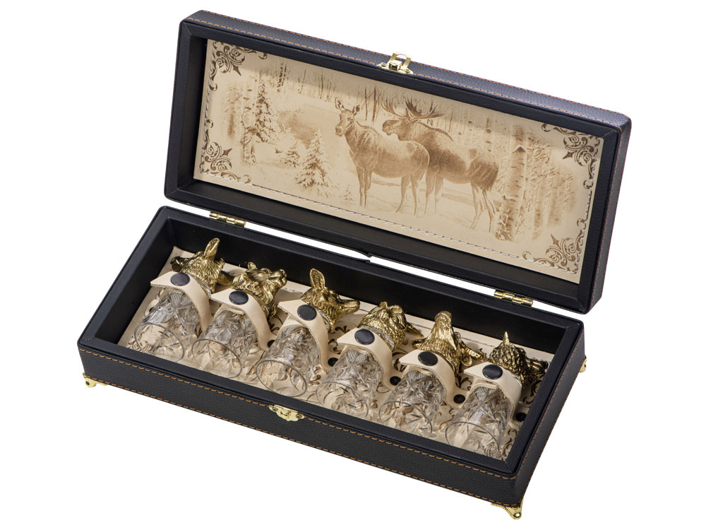 Футляр из эко-кожи, внутренняя отделка натуральная кожа молочного цвета. Рисунок нанесен путем термообработки. В набор входит шесть стопок по 50 мл. Хрусталь, литьё.