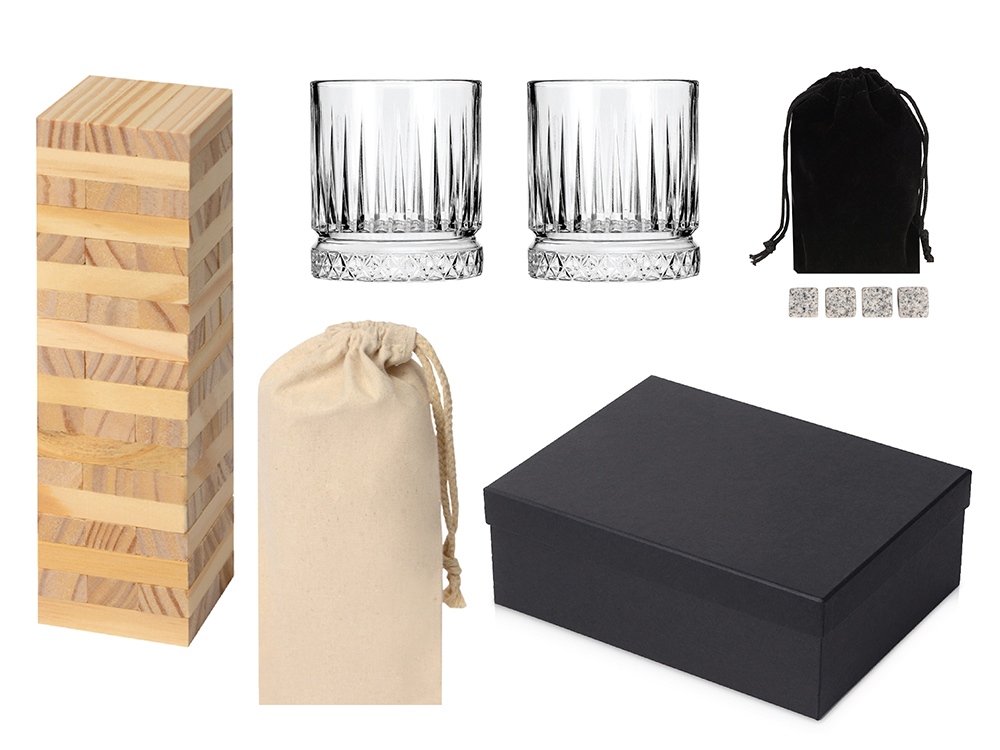 Подарочный набор с бокалами, камнями для виски и дженгой.