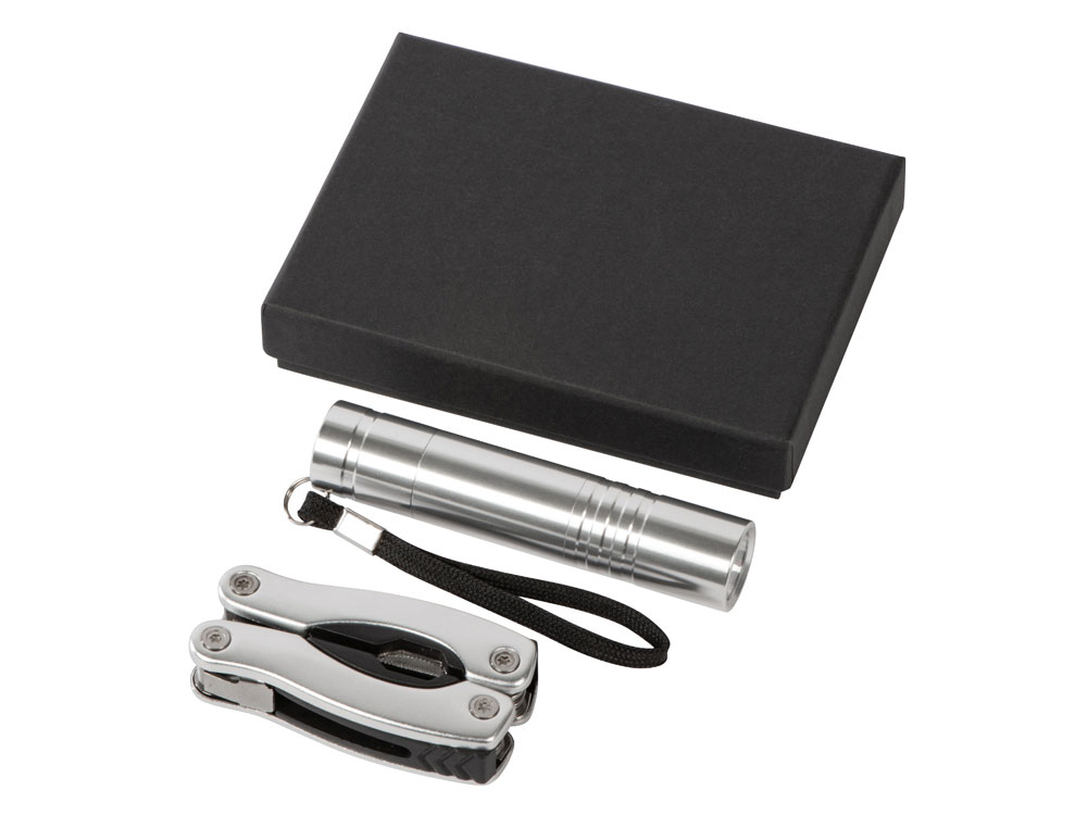 Подарочный набор Scout с многофункциональным ножом и фонариком. 11-тифункциональный инструмент с диодным фонариком упакован в черную картонную коробку. Батарейка в комплекте. Алюминий.