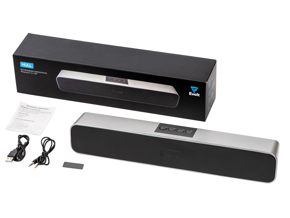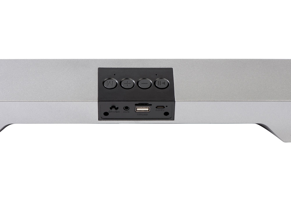 Портативная стереоколонка имеет два динамика по 3 Вт каждый, которые стереофонически распределяют звук. Саундбар воспроизводит музыку с USB-флешки и с SD-карты, а также по Bluetooth.