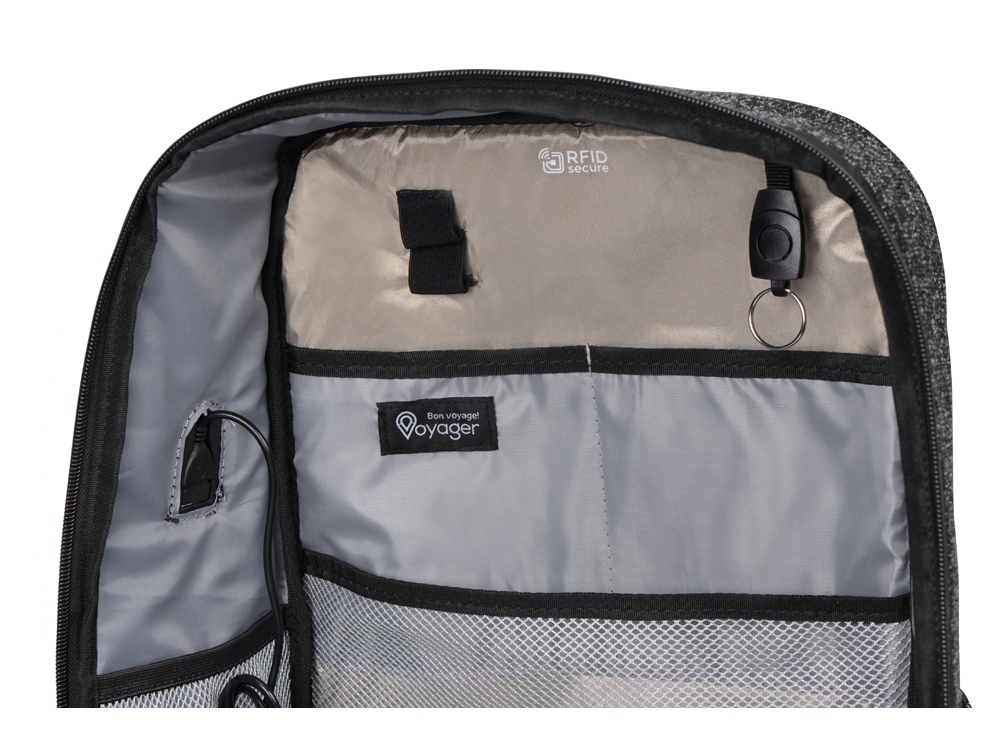 • лицевая сторона рюкзака полностью защищена от несанкционированного считывания данных по протоколу RFID — вы можете класть карточки и электронные устройства в любое отделение органайзера и быть абсолютно уверенными в их защищенности,