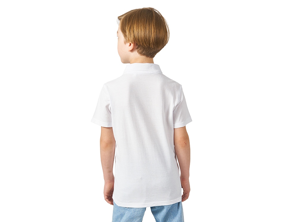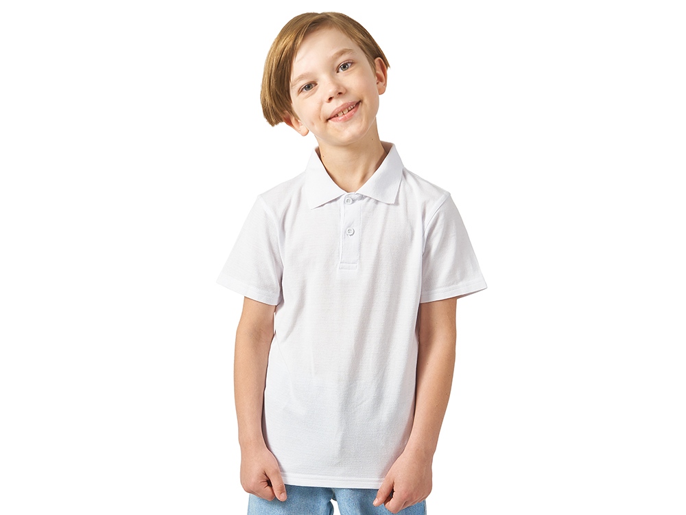 Детская рубашка поло First. Воротник 1х1. Обшивка внутри воротника. Мужская и детская модели с 2 пуговицами, женская — с 4 пуговицами. Пуговицы с гравировкой в тон. Пике, 100% хлопок. 160 г/м².