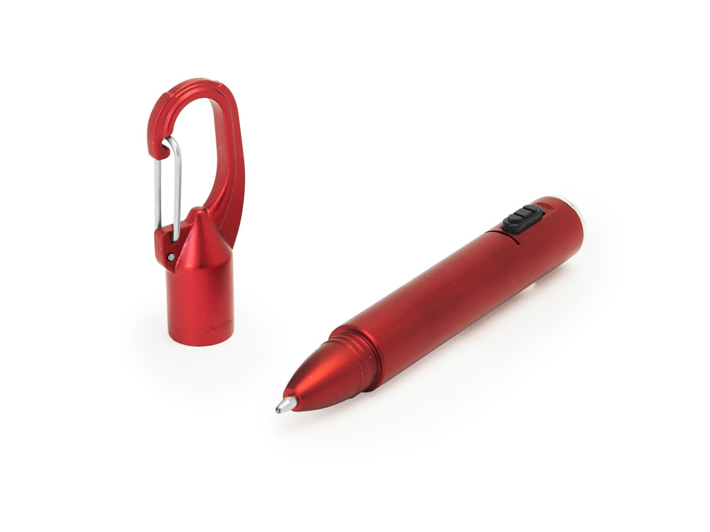 Ручка со светодиодным фонариком, доступна в различных цветах с металлическим покрытием и черной кнопкой. Встроенный карабин. Синие чернила