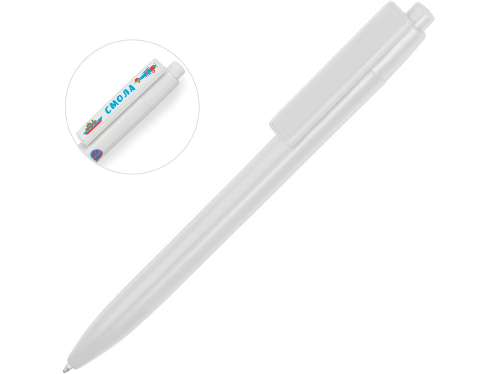 Пластиковая ручка, дизайн клипа которой разработан специально для персонализации в виде заливки смолой. Ручка с этим видом нанесения смотрится особенно эффектно благодаря объемной форме и глянцевому блеску.