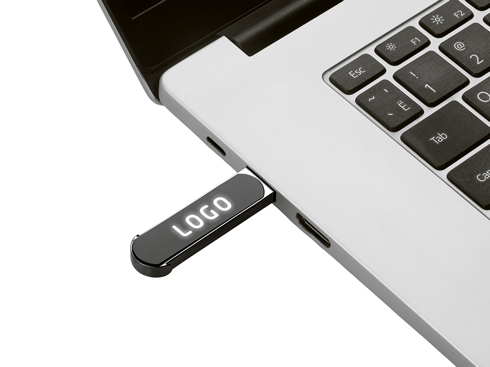 При гравировке логотипа на флешке, она светится, когда ее вставляют в компьютер.