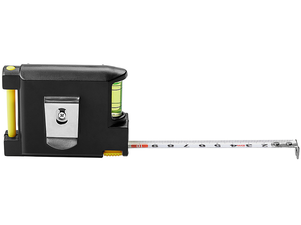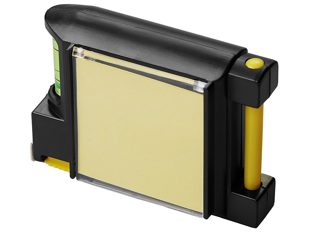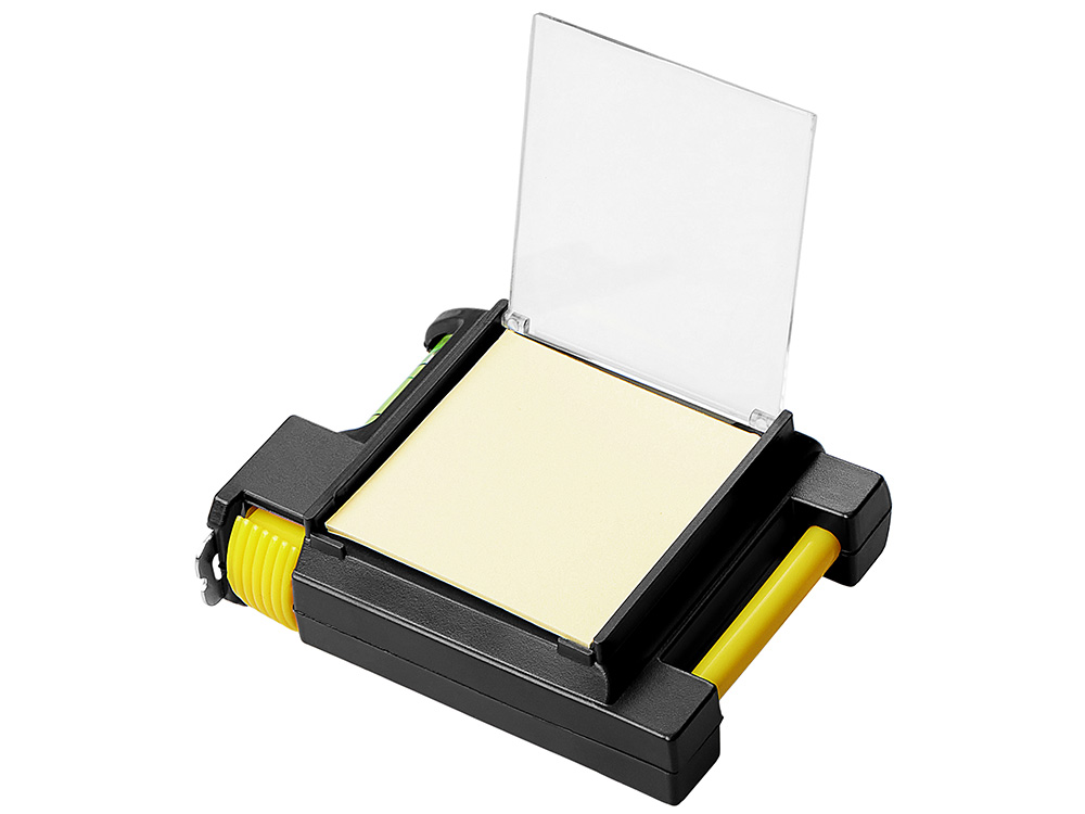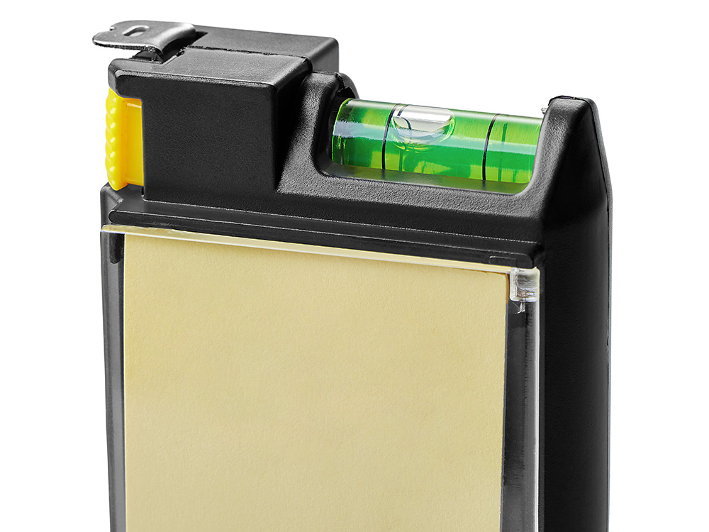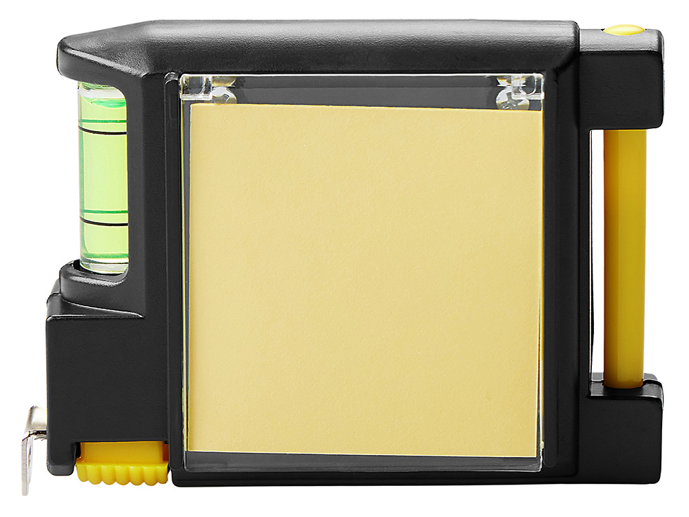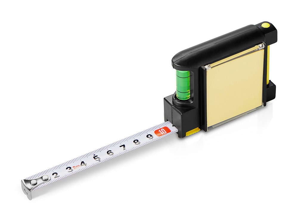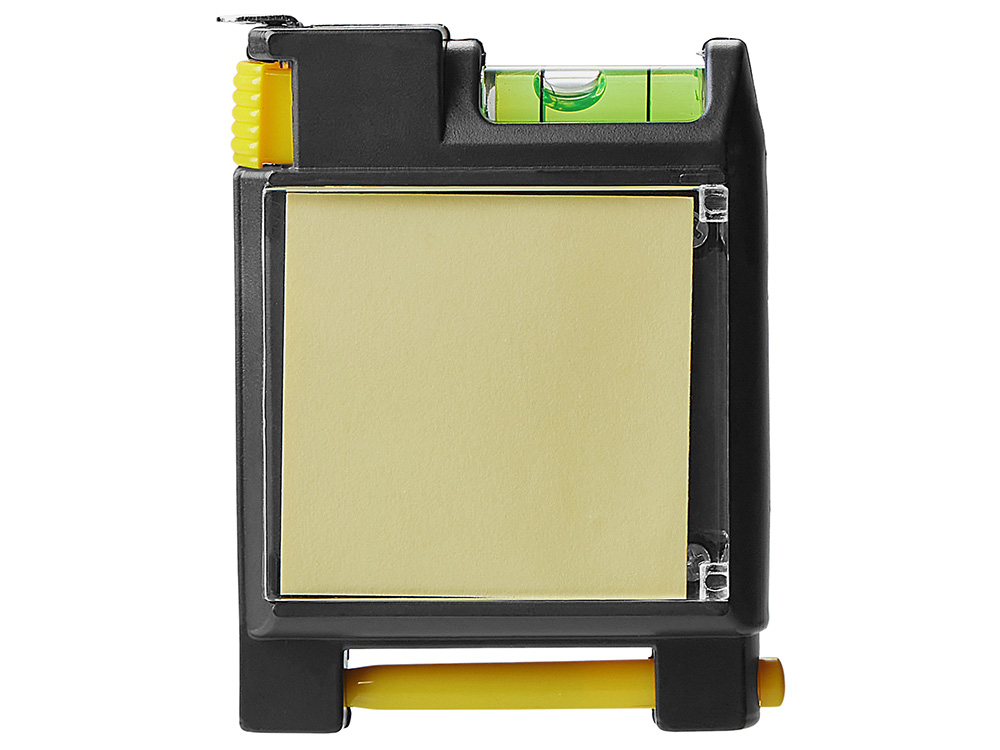 Компактная рулетка на 2 м с полезными функциями: – Блокнот и ручка для записей – Уровень – Клип для крепления к ремню