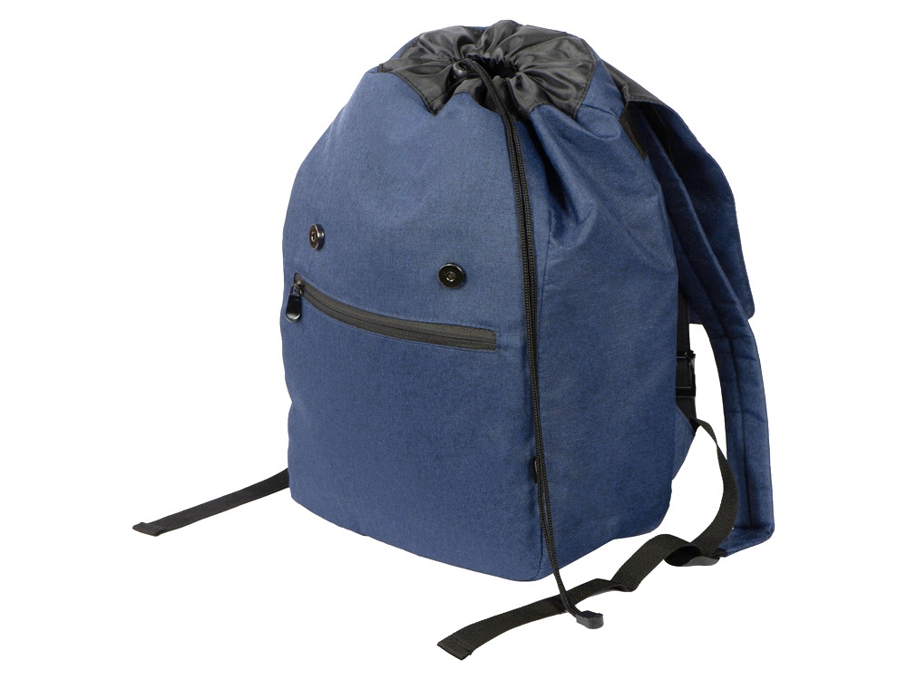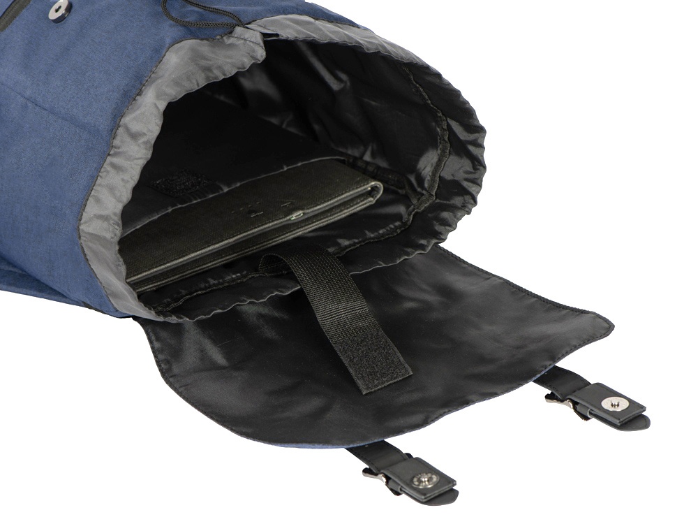 Легкий и вместительный рюкзак закрывается с помощью двух магнитов и стяжки-шнурка. Внутри расположен карман для ноутбука, который фиксируется эластичной лентой на липучке. Снаружи – карман на молнии. Лямки регулируютcя по длине.