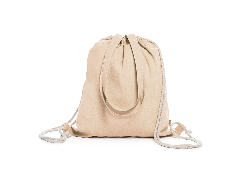 Рюкзак-мешок из переработанного хлопка плотностью 140 г/м² с меланжевой отделкой, ручками длиной 70 см в тон и шнурками натурального цвета.