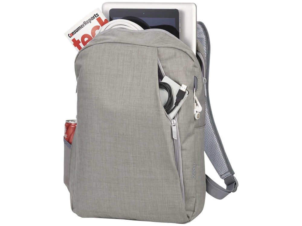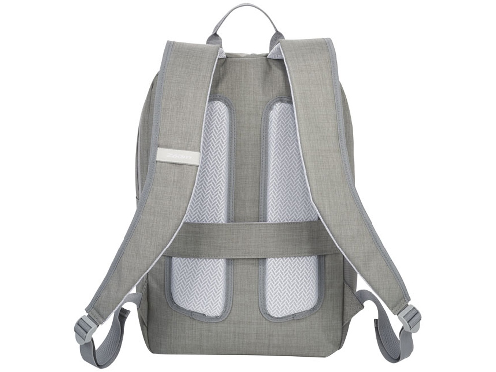 Рюкзак Zip для ноутбука 15″. Гладкая ткань с серо/серебряными акцентами. Подкладка с лого Zoom® и отверстие для шнура. Основное отделение с карманом для ноутбука до 15,6″. Карман из сетки и два дополнительных кармана для повербанка или телефона. Уплотненная спинка и шлейки, стропа для крепления к чемодану. Брендинг Zoom® и акценты. Полиэстер 210D.