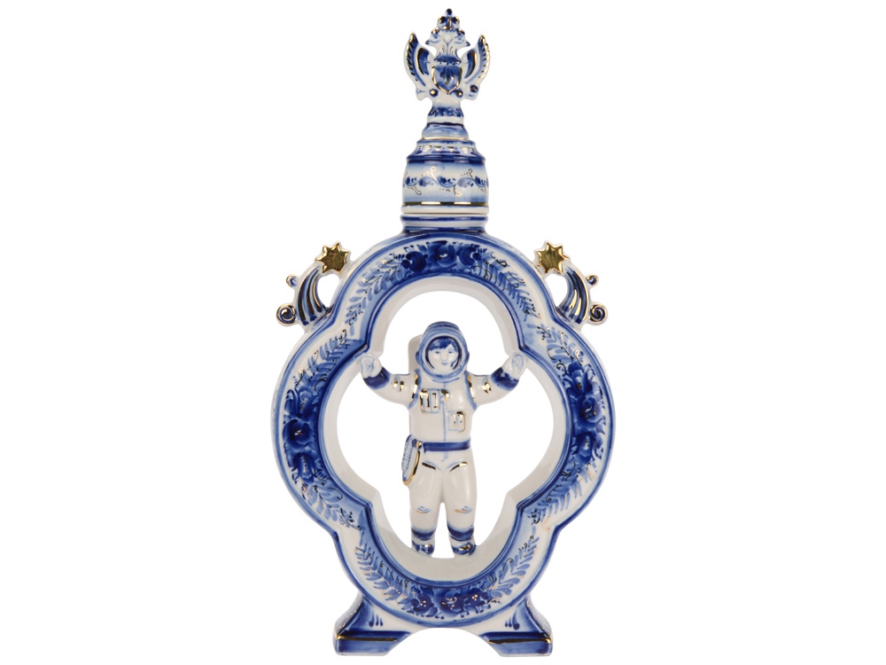 Оригинальный подарок для людей, интересующихся космосом, а также связанных с ракетостроением. Уникальный фарфоровый штоф с фигуркой космонавта и российским гербом выполнен в гжельской технике росписи.