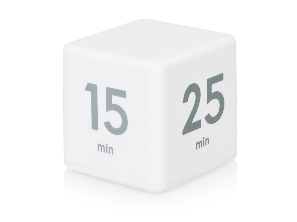 На сторонах куба напечатаны четыре предустановленных времени обратного отсчета (5, 15, 25 и 45 минут). Просто включите таймер и поверните его нужной цифрой наверх для начала отсчета времени. Когда время закончится, раздастся звуковой сигнал.