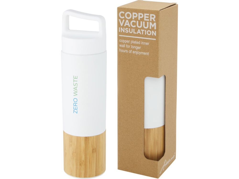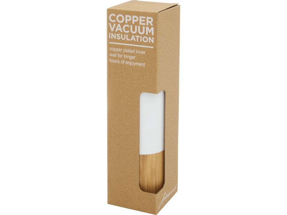 Термобутылка из нержавеющей стали 18/8 с медной вакуумной изоляцией, которая сохраняет напитки горячими или холодными в течение нескольких часов. Имеет модный элемент из бамбука; бутылку легко носить с собой благодаря ручке на верхней части крышки. Бутылка имеет широкое горлышко, поэтому ее легко наполнять и мыть. Протестировано и одобрено согласно немецкому законодательству о безопасности пищевых продуктов (LFGB), а также проверено на содержание фталатов согласно нормам REACH. Объем 540 мл. В коробке из переработанного картона. Нержавеющая сталь, бамбук.