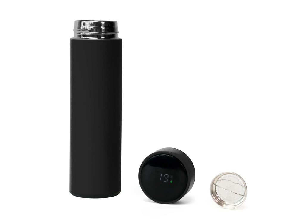 Термос из нержавеющей стали, покрытый цветным soft touch, с крышкой, в которой встроен термометр и LED дисплей, показывающий температуру внутри термоса. Объем: 500 мл. Упаковка: каждый термос в крафт коробке.