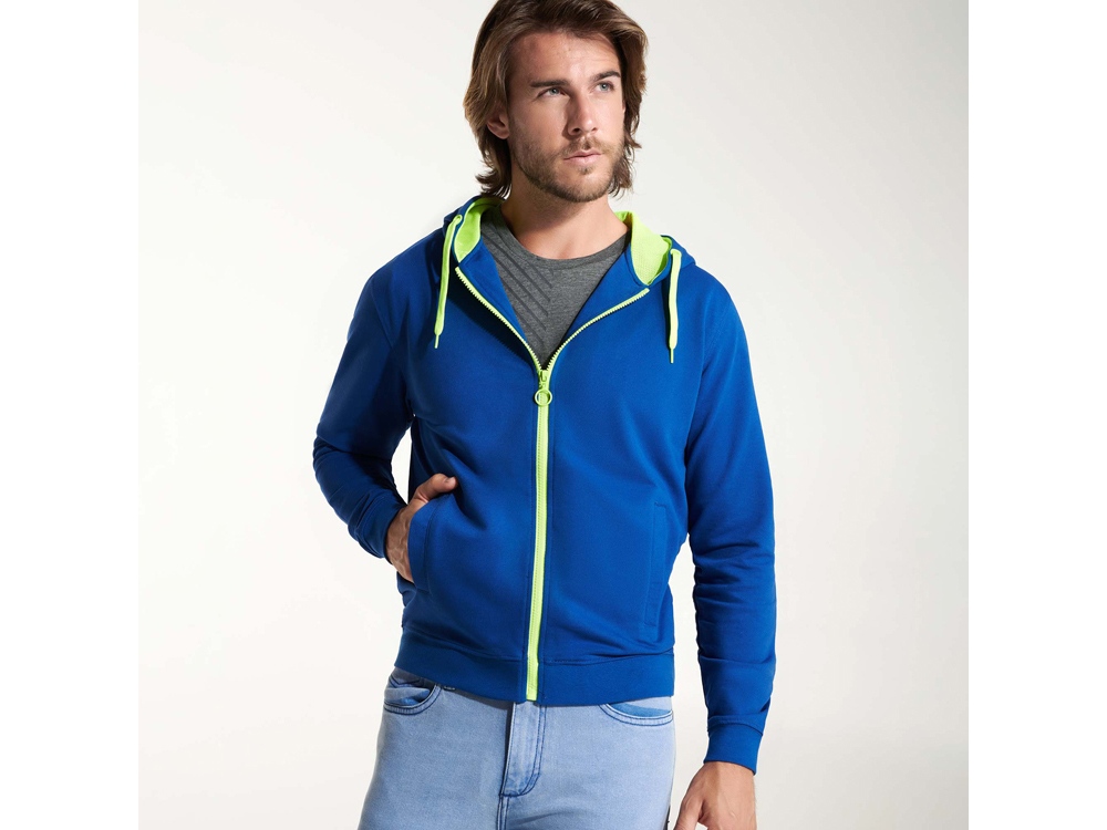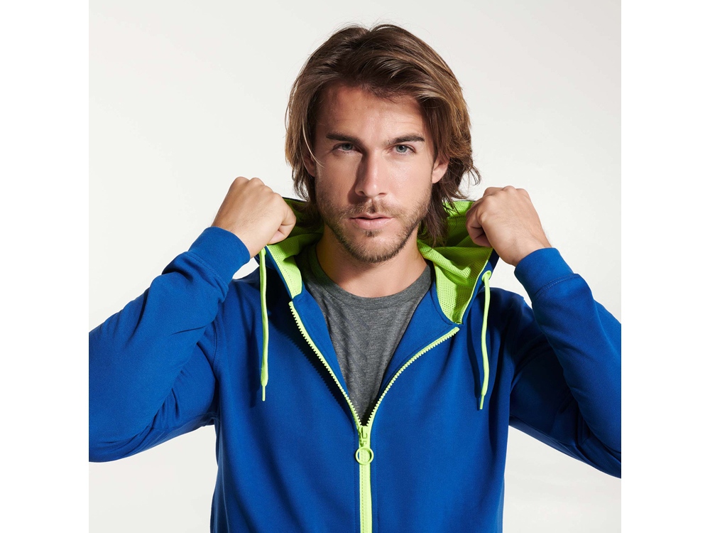 Толстовка на молнии из френч терри без начеса с деталями неонового цвета. Центральная молния с контрастным пуллером. Подкладка капюшона из микроперфорированного полиэстера контрастного неонового цвета. Шнур капюшона и айлетсы контрастного неонового цвета. Риб 1х1 на манжетах и внизу изделия. Два боковых кармана с широкой листочкой. Укрепляющая строчка внутри горловины.