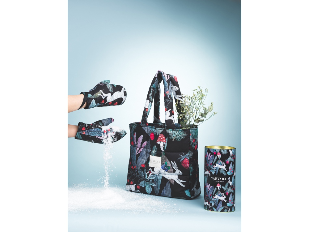 Авторский принт написан художницей вручную специально для российского бренда Varvara. Художница размышляла на тему русской природы, культуры и искусства — тут и лесная земляника, и сочная зелень, и конечно, сказочные зайцы — как будто только что сошли с полотен В. Васнецова.
