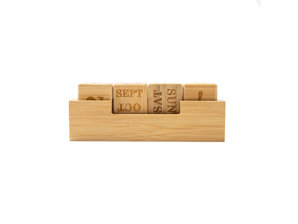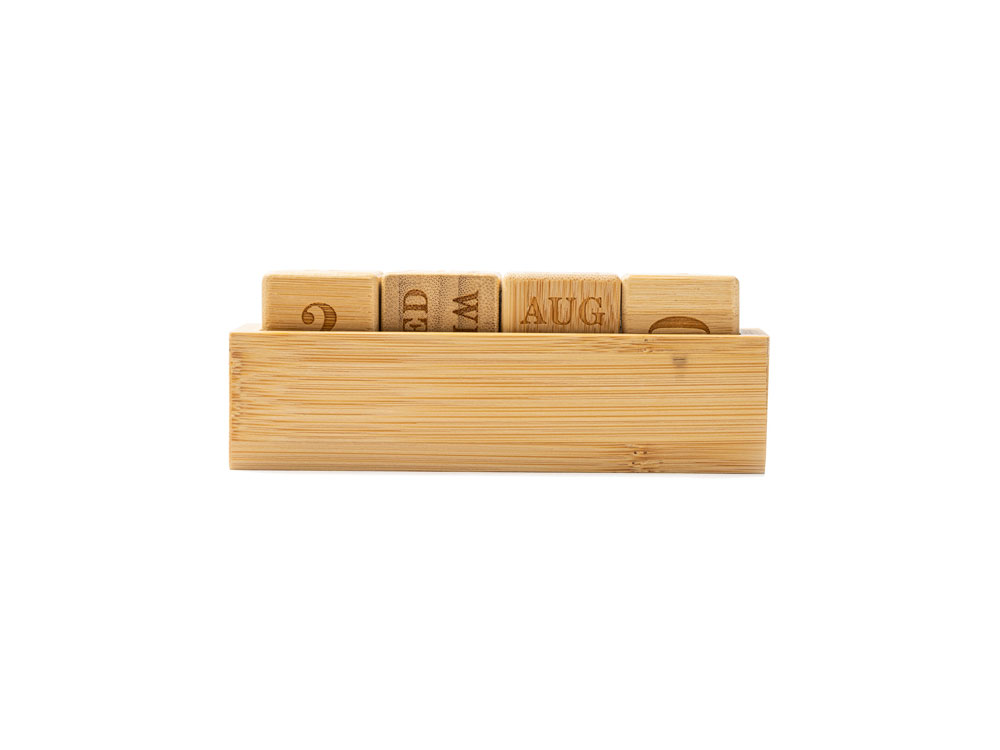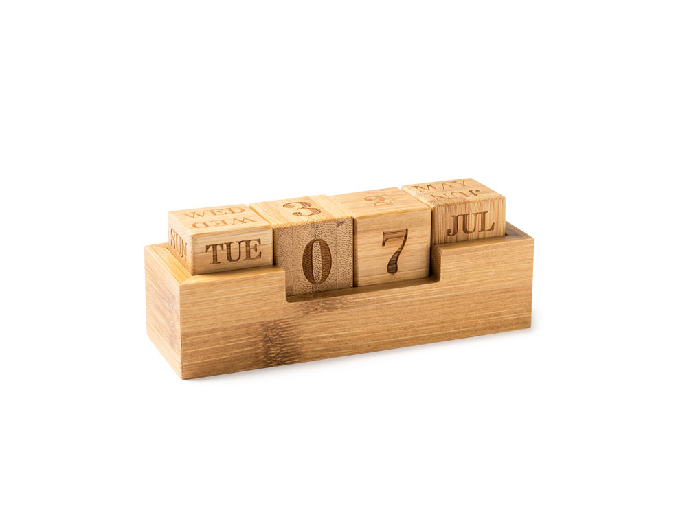 «Вечный» настольный календарь из бамбука, состоящий из одной подставки и четырех блоков с гравировкой.