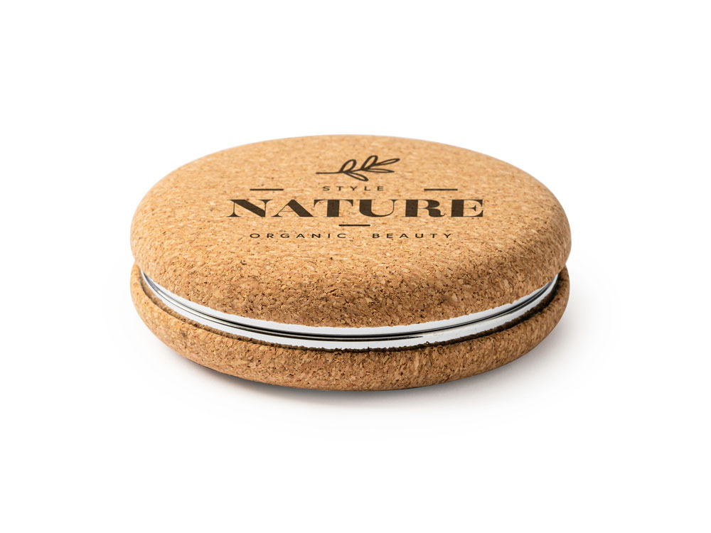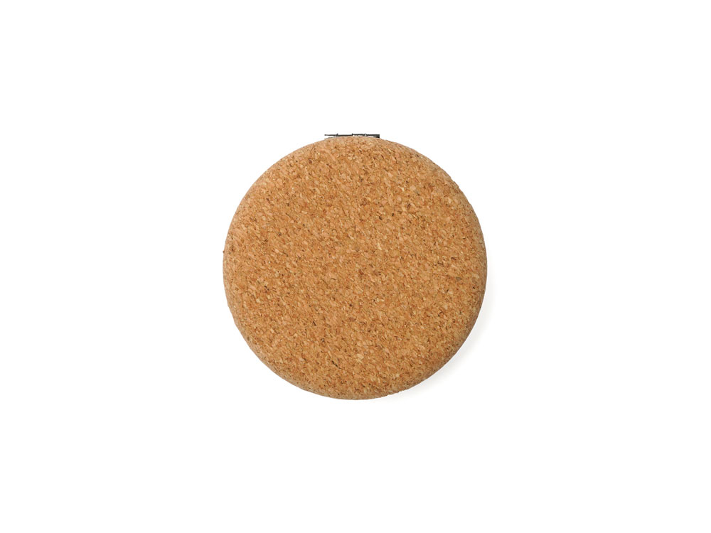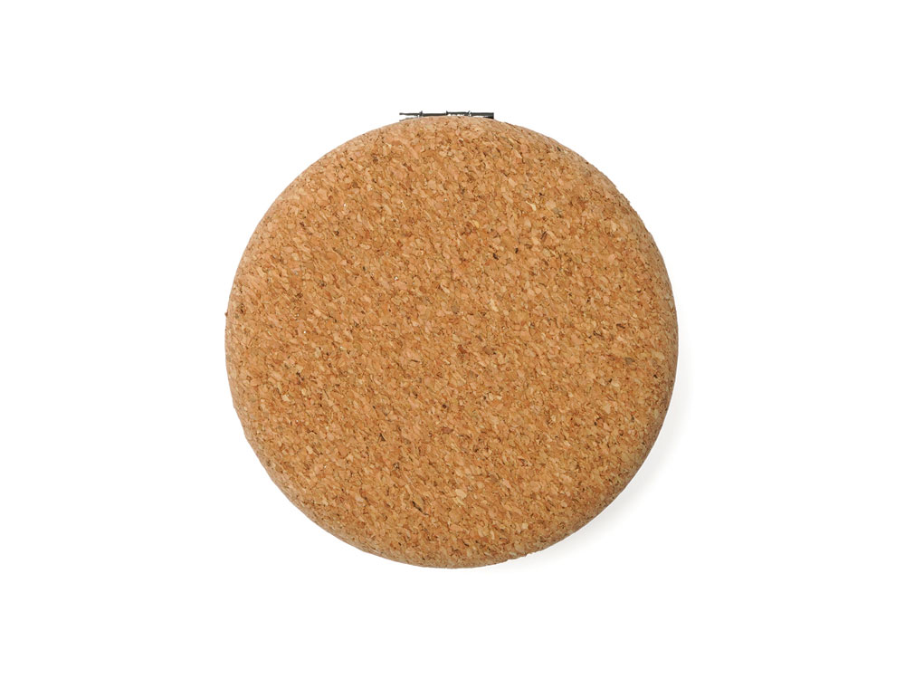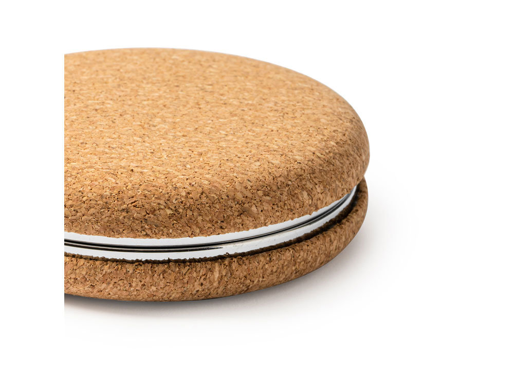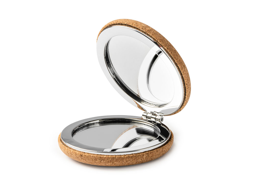 Складное зеркальце из натуральной пробки и хромированного металла, состоящее из двух зеркал, обычного и увеличивающего.